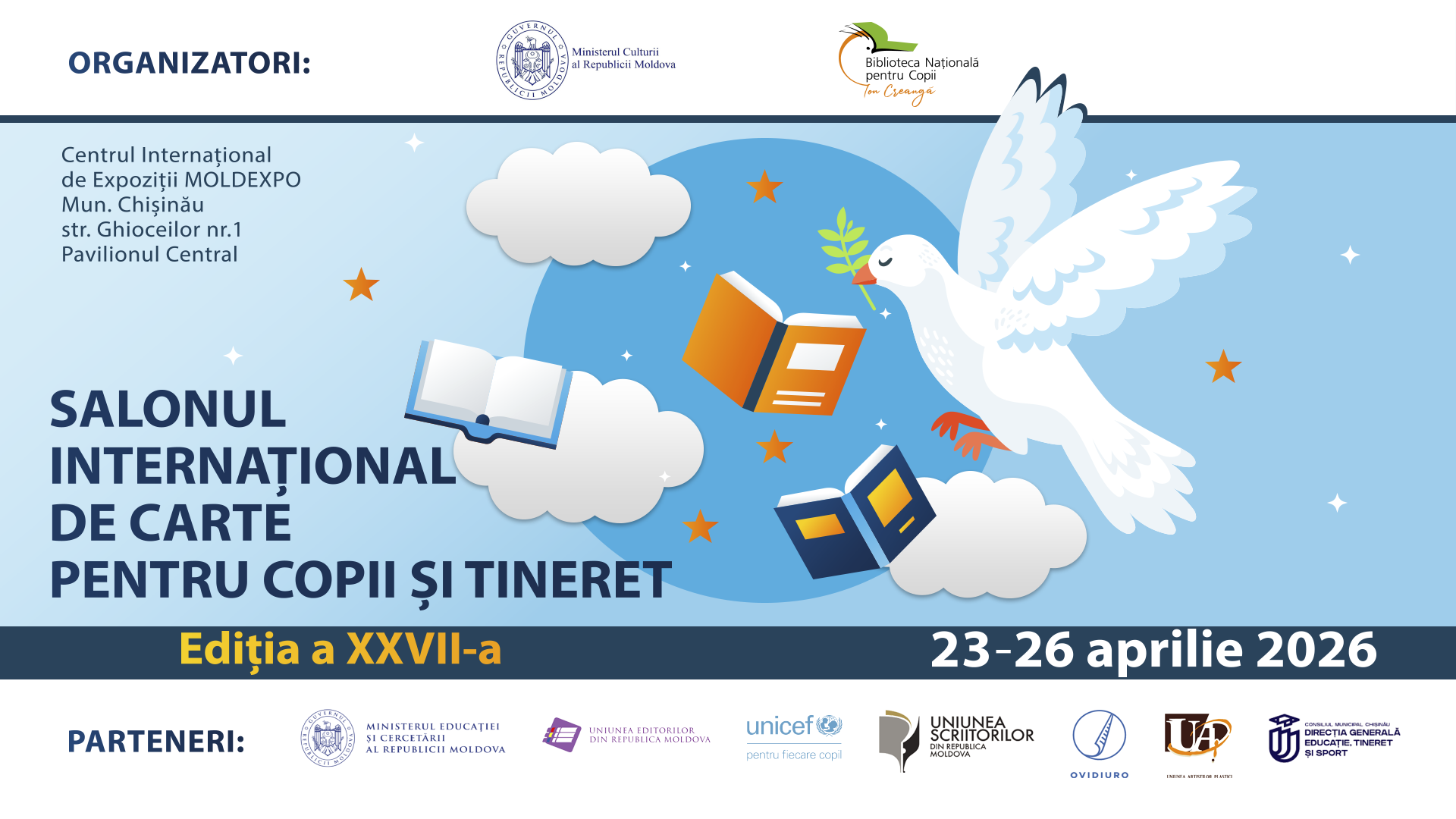 Copiii, tinerii, părinții acestora, cadrele didactice și toți cititorii sunt invitați în perioada 23-26 aprilie 2026, la Centrul MOLDEXPO, în Pavilionul Central, unde se va desfășura ediția a XXVII-a a Salonului Internațional de Carte pentru Copii și Tineret.Evenimentul este organizat de Biblioteca Națională pentru Copii „Ion Creangă” cu sprijinul financiar al Ministerului Culturii al Republicii Moldova și în parteneriat cu Ministerul Educației și Cercetării al Republicii Moldova, UNICEF Moldova, Secția Națională IBBY, Uniunea Editorilor din Republica Moldova, Uniunea Scriitorilor din Republica Moldova, Uniunea Artiștilor Plastici din Republica Moldova, Asociația OvidiuRo și alte organizații.
